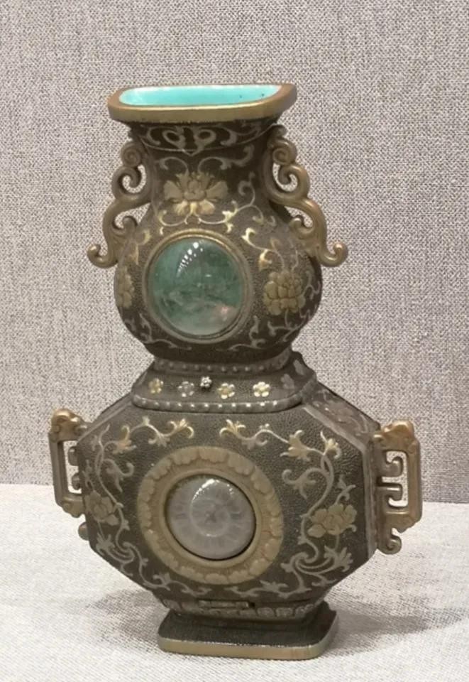 清乾隆 仿黑鲨鱼皮釉嵌钟表葫芦式壁瓶