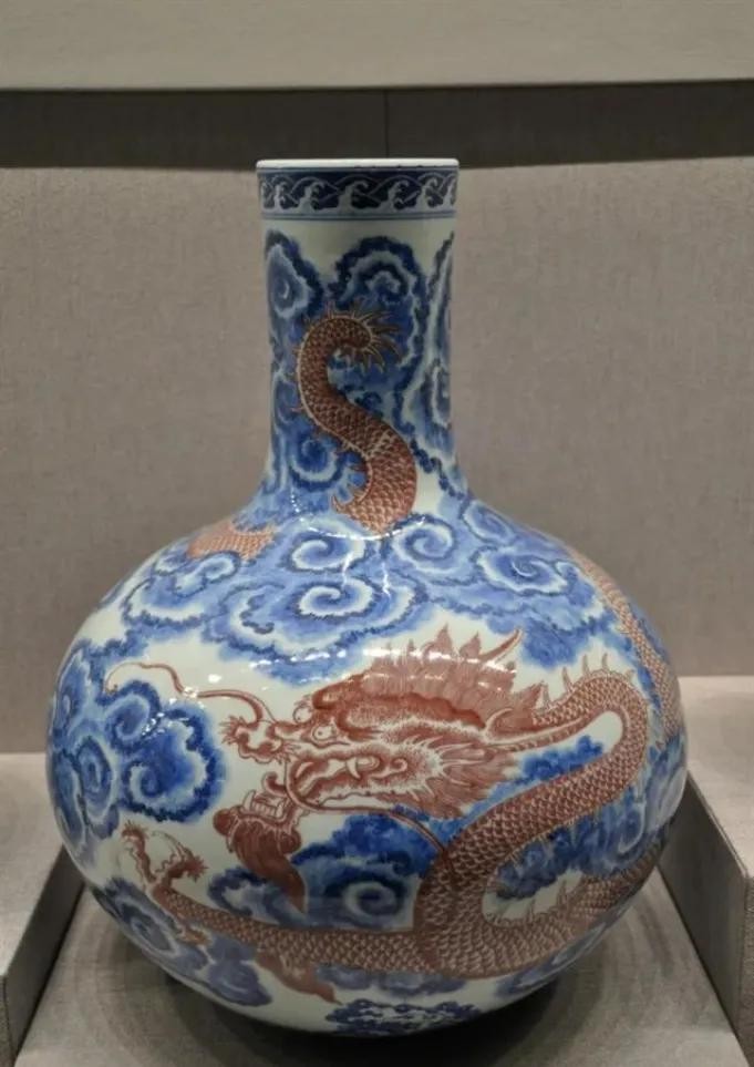 乾隆款青花釉里红云龙纹天球瓶,高47cm,口径10.7cm,足径15.5cm。瓶直口、长颈、腹浑圆似球、圈足。内施白釉,外壁以青花、釉里红绘云龙出海。外底署青花篆体“大清乾隆年制”六字三行款。
