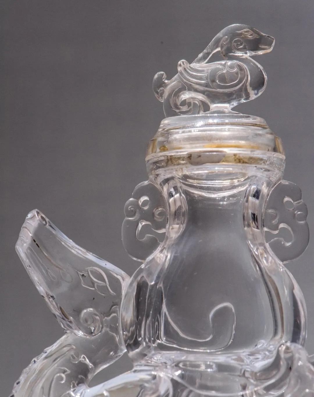 兕觥为古代酒器,主要见于青铜器。此件水晶兕觥的造型、纹饰都是仿造于古代青铜器,材料难得,雕琢精美,为清代中期乾隆时仿古器物之珍品。