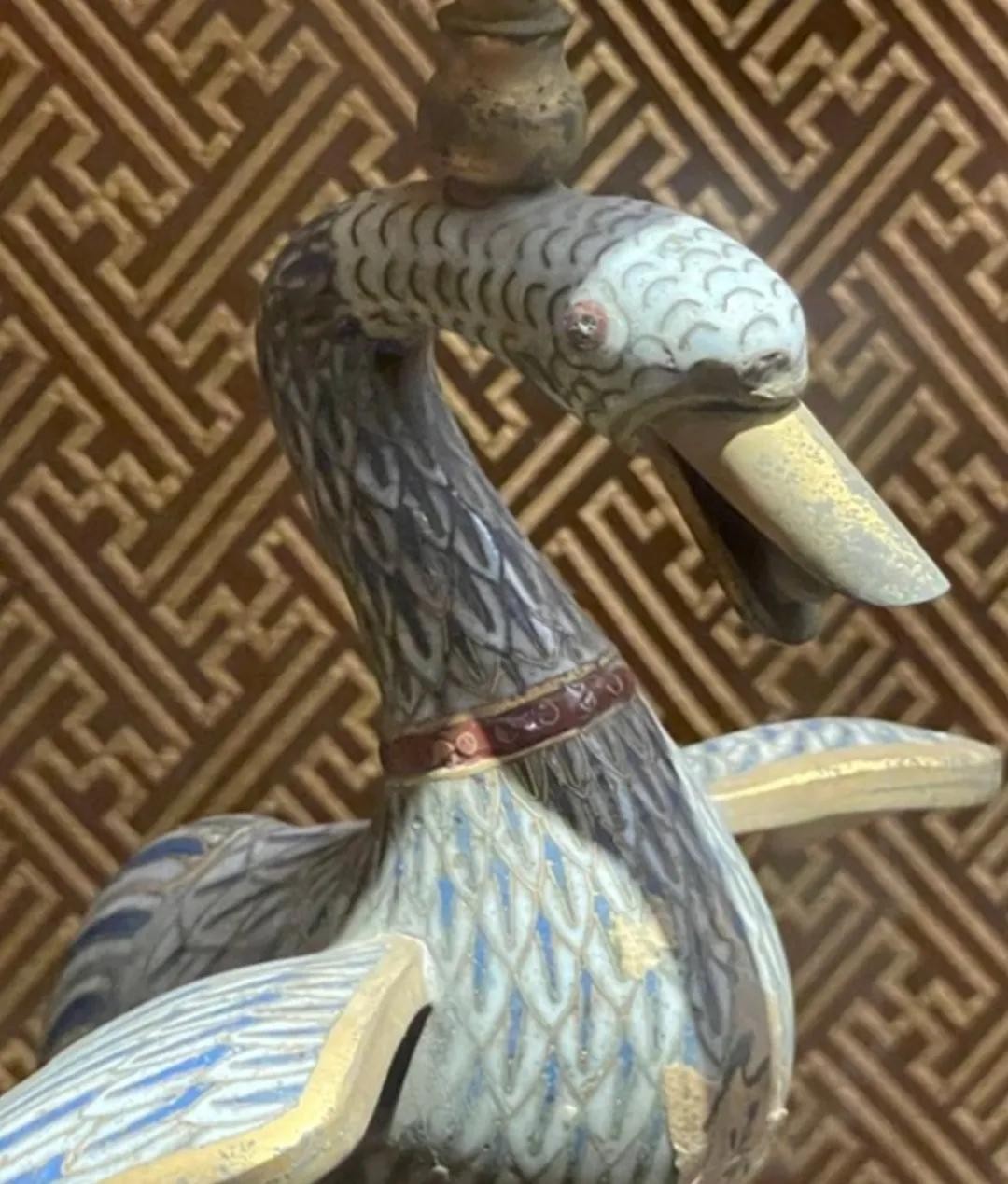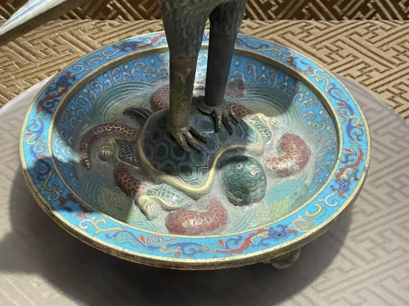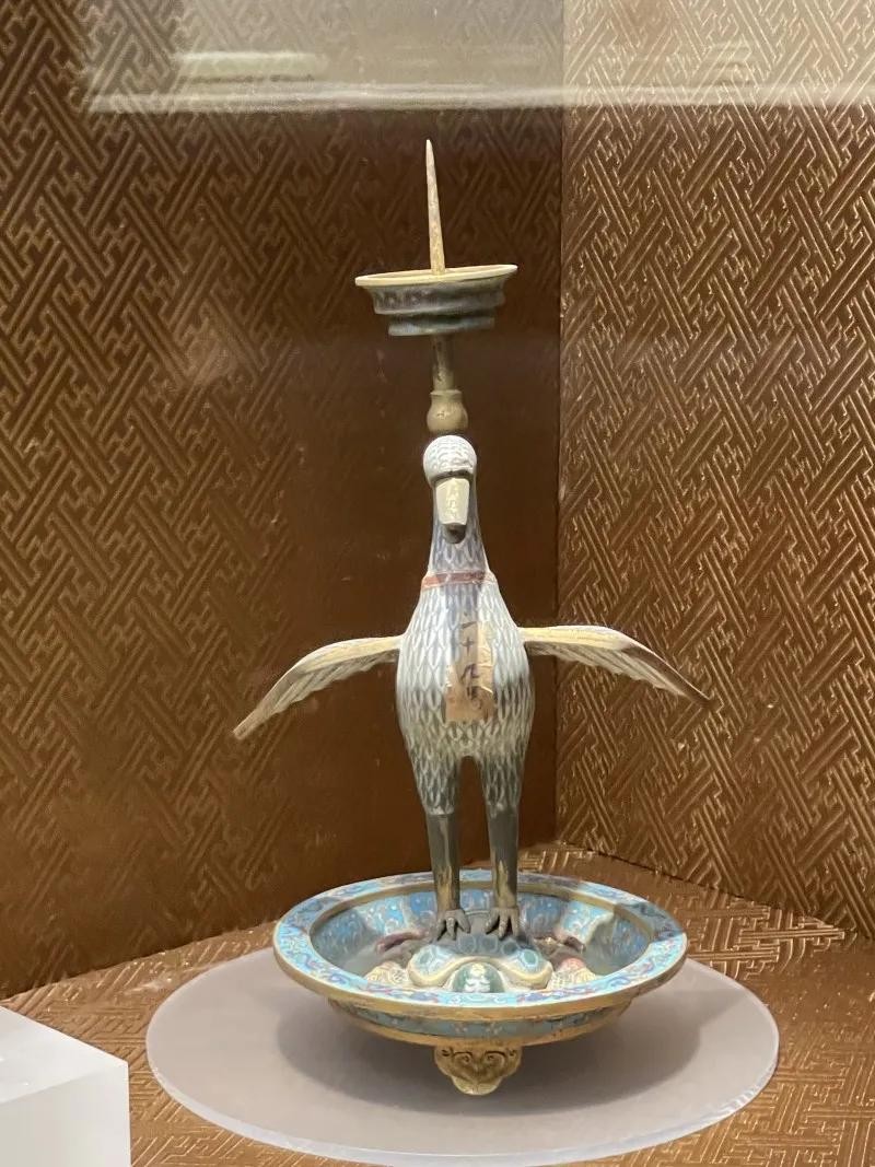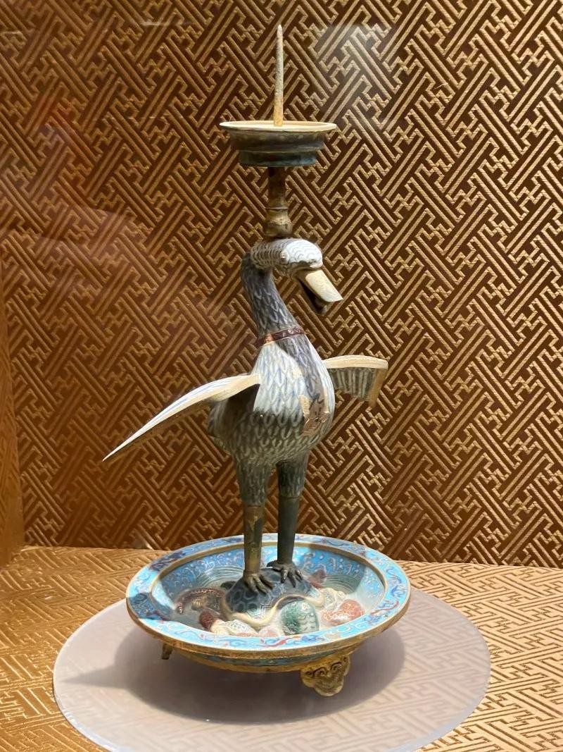 此烛台是乾隆时宫中御用烛台。以一只伸展着优美的脖子、飞翔停立于龟背之上的海鸟为造型,新颖别致,制作精美。海鸟全身白色珐琅作地,掐丝成羽翎纹,嘴中咬着一颗珍珠,头顶烛台。乌龟的四周饰海水波浪纹,盘外装饰一圈垂直的花瓣,三个金色的如意支脚支撑着整个烛台。寓意天下太平,国泰民安。