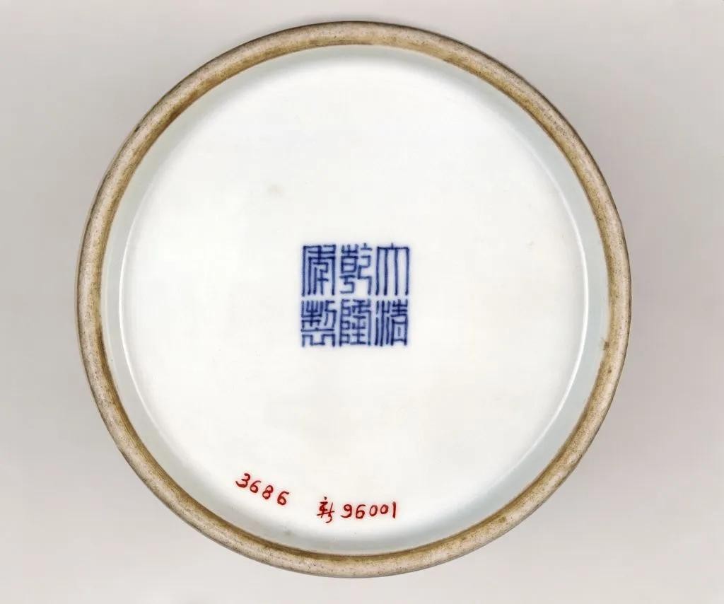 瓶内及圈足内施松石绿釉,外底中心署青花篆书“大清乾隆年制”六字三行款。