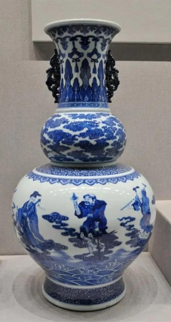因“葫芦”与“福禄”音近,故葫芦瓶寓意“福禄”,具有“祝福”的含意。葫芦瓶是明、清时期瓷器中比较多见的造型。此器配有八仙图案,寓意“八仙祝福”。