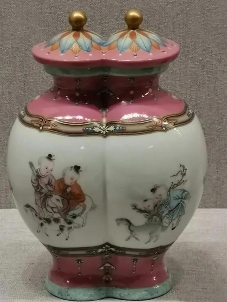 双连瓶又称合欢瓶,是清乾隆时期流行的瓶式之一。此瓶色彩温馨,装饰题材吉祥喜庆,尤其是幼童的刻画煞是可爱。
