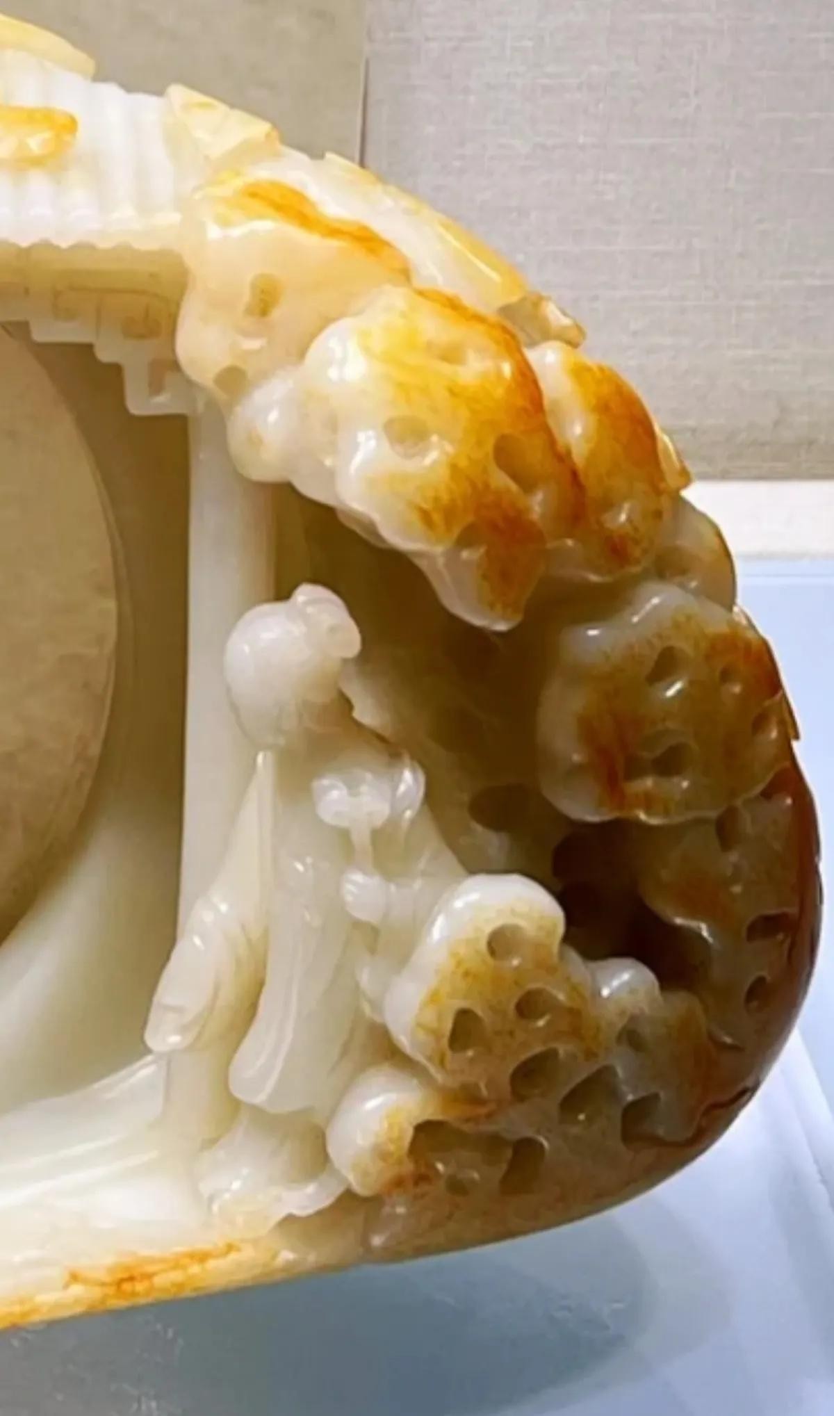 本器从内容到风格皆仿油画《桐荫仕女图》而作,所用玉料实为雕碗后的弃物,但玉工巧为施艺,庭院幽幽,人物传神,人们似可听到两女子透过门缝的窃窃私语。剩料被加以利用,这种取其自然之形和自然之色传以生动之神的做法,正符合“势者,乘利而为制也”(《文心雕龙·定势》)。此器是清代圆雕玉器的代表作。