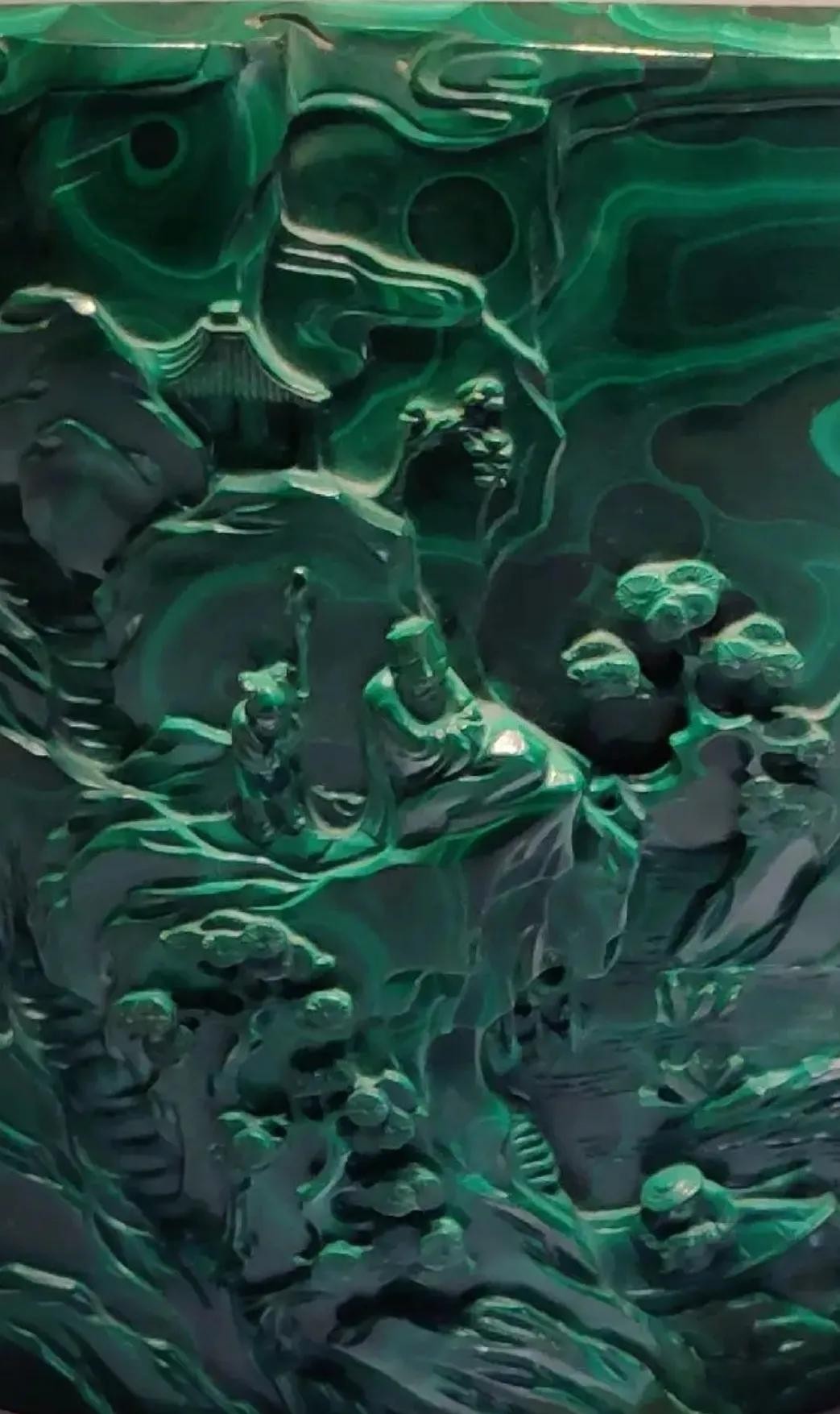 此插屏使用的孔雀石质地细密无孔,颜色鲜亮纯正,深浅不同的条带状纹理清晰夺目。工匠充分利用了上述特点,使一片郁郁葱葱、富有生机的山景跃然屏上。