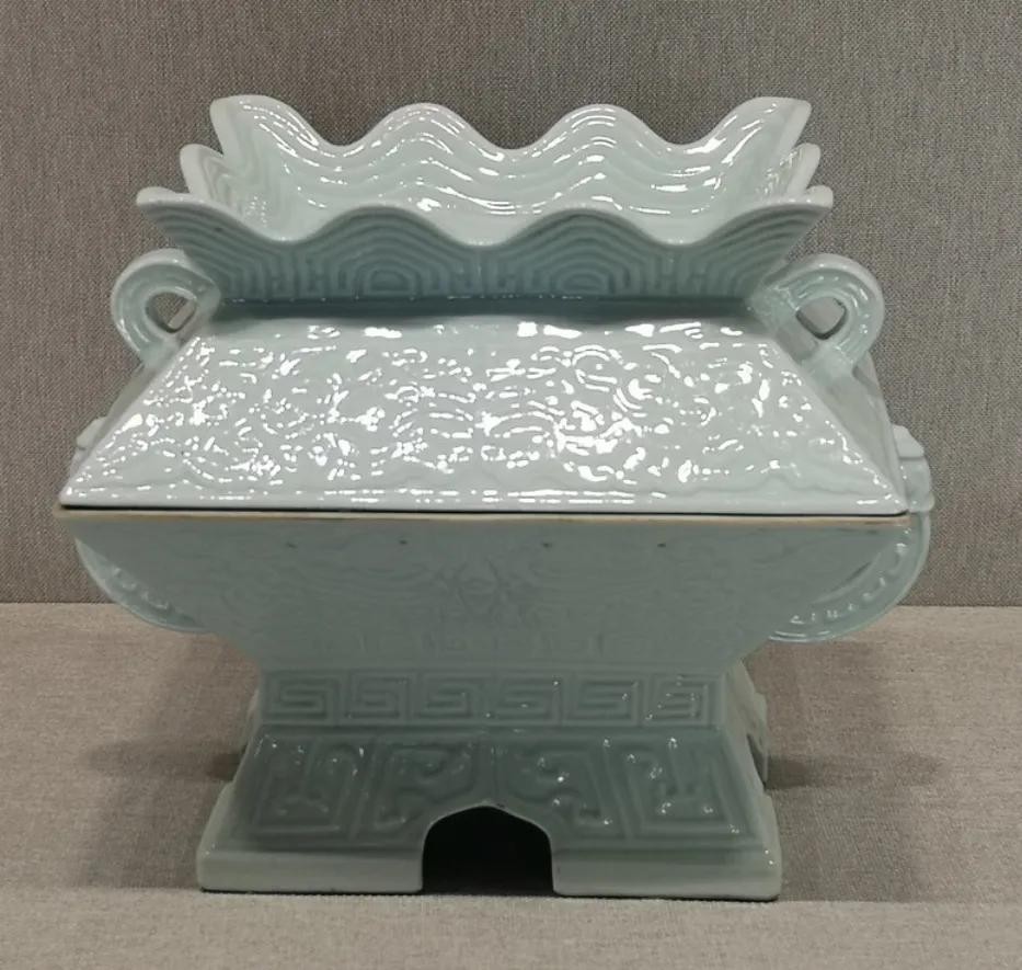 此铡仿古铜铡造型。椭圆体形、盖上置三棱、腹部两侧对称附牺耳。通体施白釉。通体刻划藻纹、回纹、贝纹、云纹等。造型规整,做工精细,与《皇朝礼器图式》记载相符。