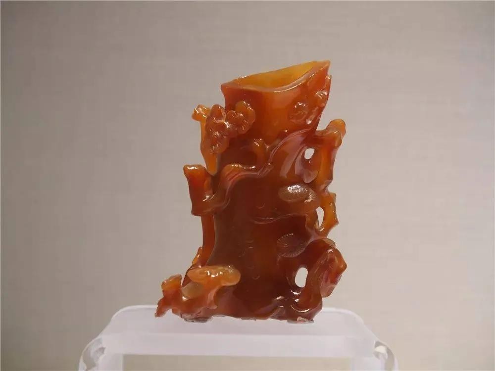 玛瑙树桩形花插高10.1cm,宽7cm。花插为暗褐色玛瑙质,树桩形,器中空,可做花插。器身外凸雕松枝、竹枝、梅枝及灵芝。
