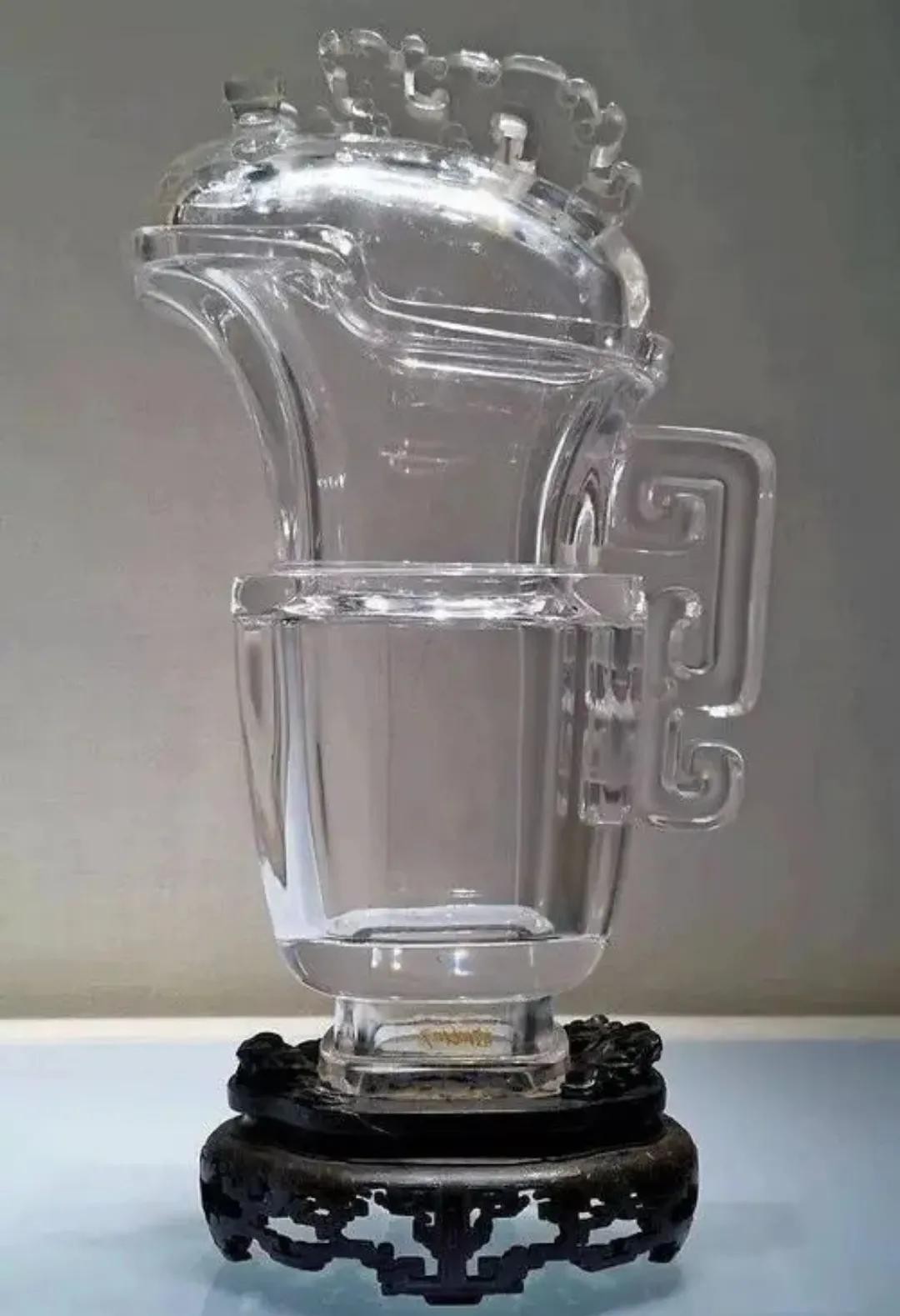水晶兕觥(sì gōng)通高22.6cm,腹宽8.5cm,口径6.5×12cm。觥水晶质。无色透明,光洁纯净。椭圆形体,通体光素。有盖,盖面雕角兽首,兽首双角。器口前高后低,呈坡状。觥后侧中部透雕夔式柄。椭圆形高足,底配以嵌银丝红木座。