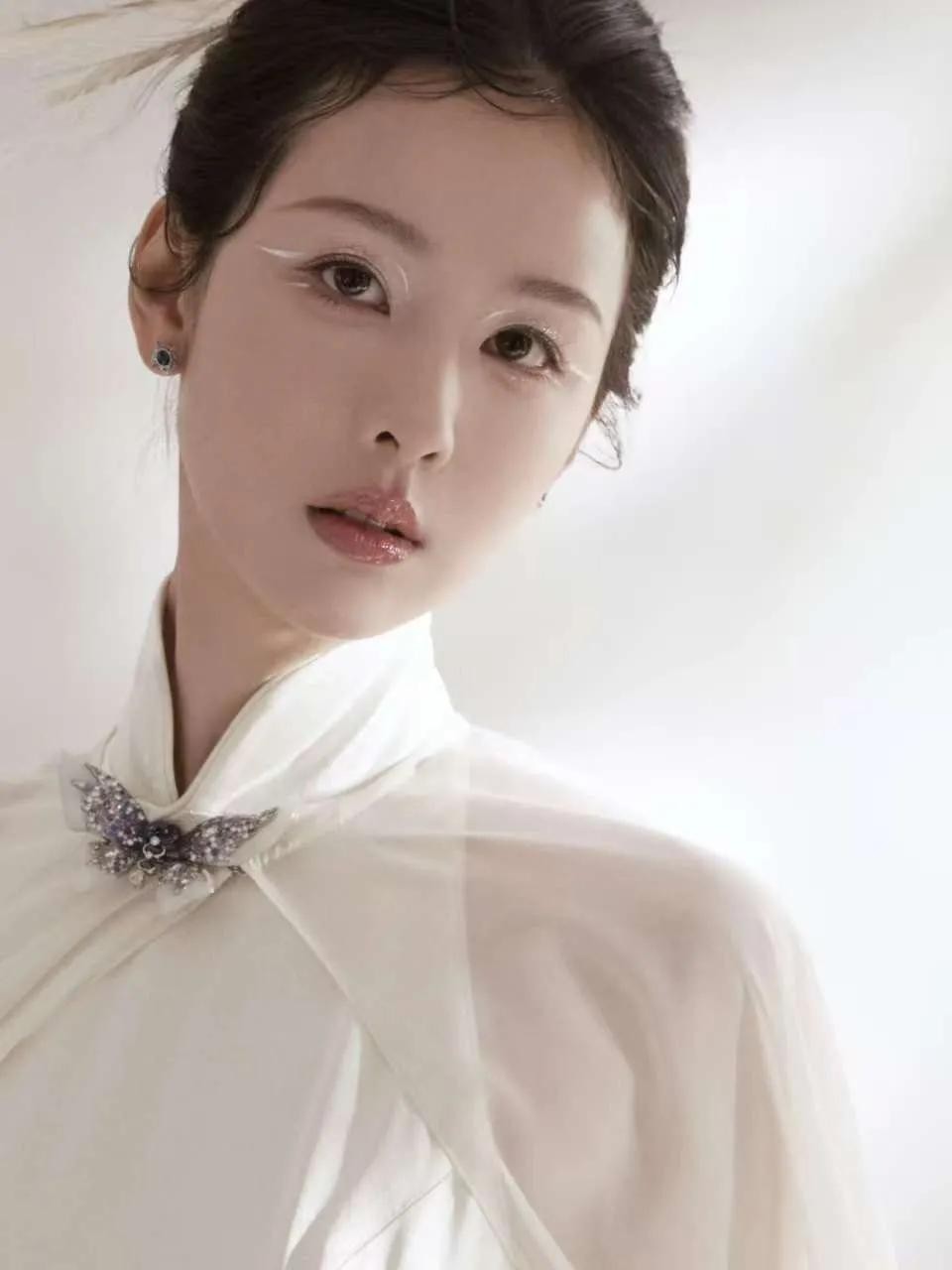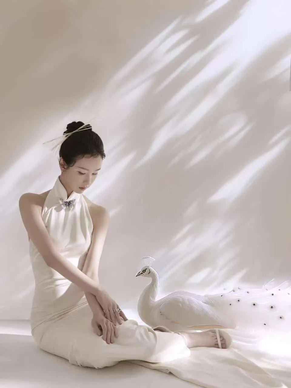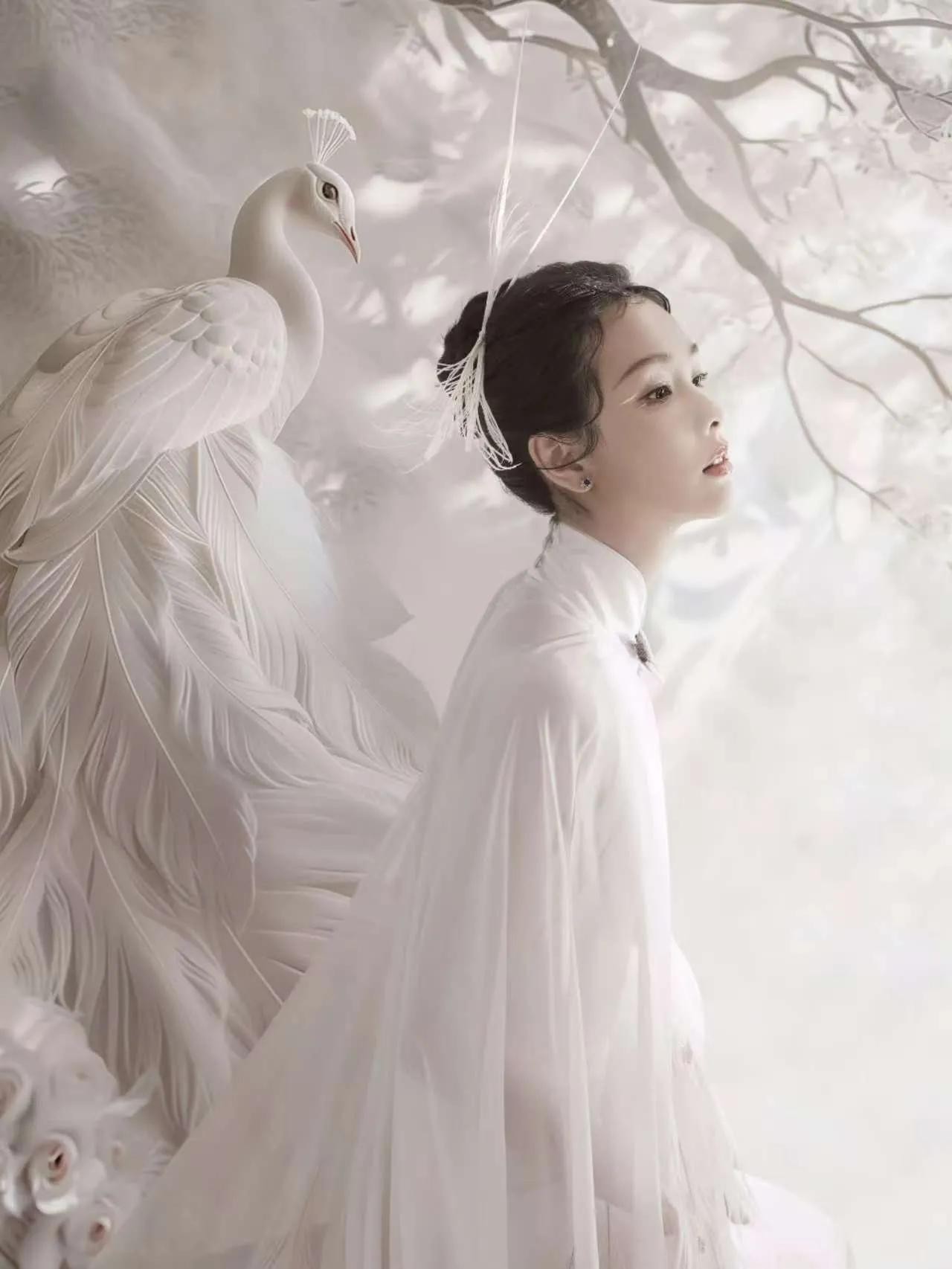 陈都灵宛如一只优雅的白孔雀,在光影交织的画布上轻轻起舞。她身着一袭素雅的白裙,精巧的立领勾勒出脖颈的优美弧度,领口的装饰如同孔雀翎羽般细腻。轻纱般的披风随风飘逸,下摆处点缀的羽毛在空中轻盈舞动,仿佛白孔雀展开的尾翼。乌发高绾,眉眼如画,在这份东方韵味中,举手投足间尽显婉约与灵动。