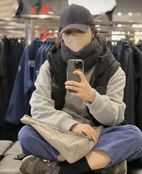 照片中,李佳身穿灰色卫衣和黑色马甲,头上戴着一顶帽子,把自己裹得严严实实,打扮朴素低调似路人,超接地气。