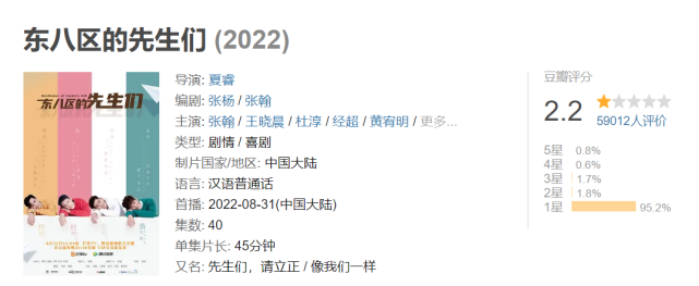 据悉,《东八区的先生们》是由张翰、王晓晨、杜淳、经超、黄宥明领衔主演,张翰还是这部剧的编剧,所以从一开始网友对这部剧的期待值就很高,但没想到这部剧的豆瓣评分只有2.2分,有95.2%的人打出了1星,5万多人全部都给了差评,这么低的分足以说明这部戏的质量不高,但没想到,这部剧中还有很多让人无法理解的镜头,疑似还有职场骚扰。