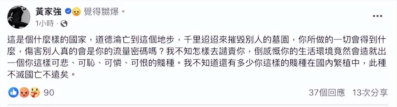 而令人不解的是,黄家驹的弟弟黄家强,在事后的回应中,竟然将责任推到了整个国家的身上。他在社交平台上发帖称,"这是个什么样的国家,道德沦亡到这个地步,千里迢迢来摧毁别人的墓园,你所做的一切会得到什么,伤害别人真的会是你的流量密码吗?"