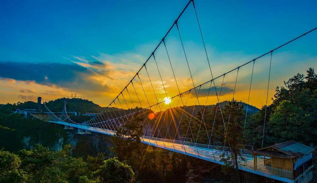 该桥全长388米,垂直高度180米,横跨马仁奇峰太阳山与主峰之间,连接天梯玻璃栈道共同组成了一个高空体验观景胜地。