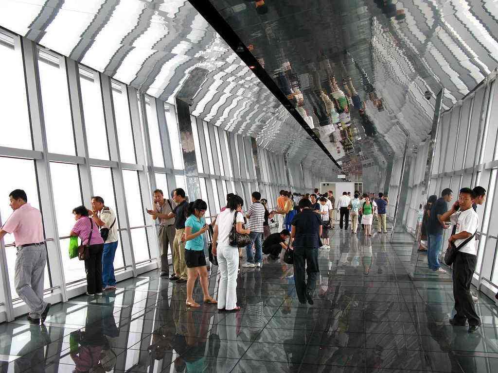 上海环球金融中心观光天阁是一条长约55米的悬空观光长廊,为目前世界上较高的观光设施,内设三条透明玻璃地板,走在上面还能体验一回会当凌绝顶,一览众山小的豪情快意。