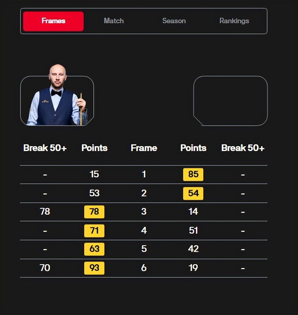 第二局,乔伊斯又以54-53一分险胜,2-0领先。第三局,开场连丢两局之后,乔伊斯在本局开启反击模式,他的单杆78分制胜,78-14扳回一局,比分追成1-2。