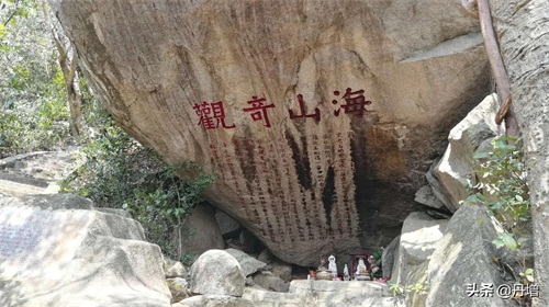 3.海山奇观,宋淳佑年间(公元1247年)郡守毛奎率僚属于鳌山中几经寻访,获一巨石,如屋如舫,前瞰大海,后环曲巷,石上可以尽览海山之大观,因题"海山奇观"。