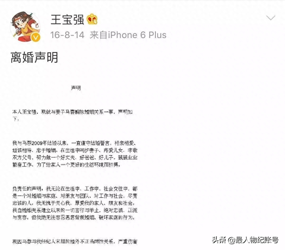 2016年8月14日0时21分,王宝强在微博发声明称妻子马蓉与经纪人宋喆有婚外不正当两性关系,宣布与马蓉离婚。