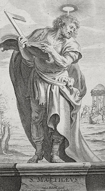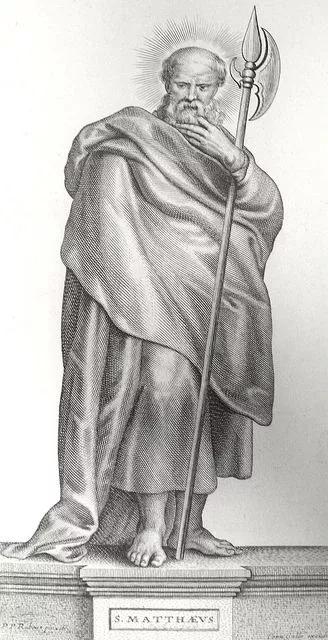玛窦又名肋未,本是一个罗马的税吏,受犹太同胞恨恶和鄙视。后著有玛窦圣道,向犹太同胞传扬圣道。晚年曾到中东各地,走遍非洲衣索比亚,建立公教,并在波斯就义。