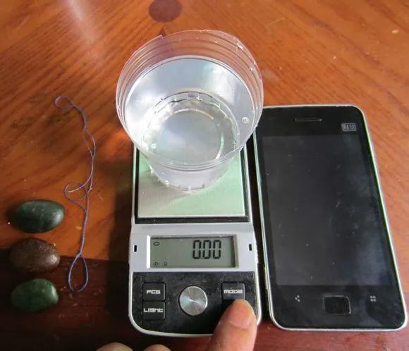 待稳定后,把电子秤归零,然后用一根细线绑住饰品,吊在杯子水中中央,