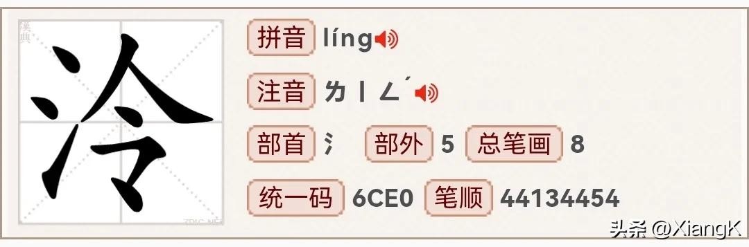 读音为【líng】、同音字“灵”、部首为氵、总笔画8、左右结构。