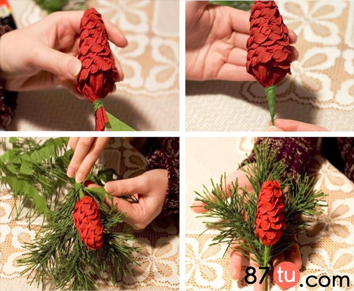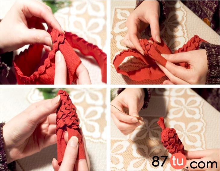 绕好后的样子多做几根,缠一块,红色松果制作步骤:取暗红色皱纹纸,裁剪出成宽度约为5cm的长条。