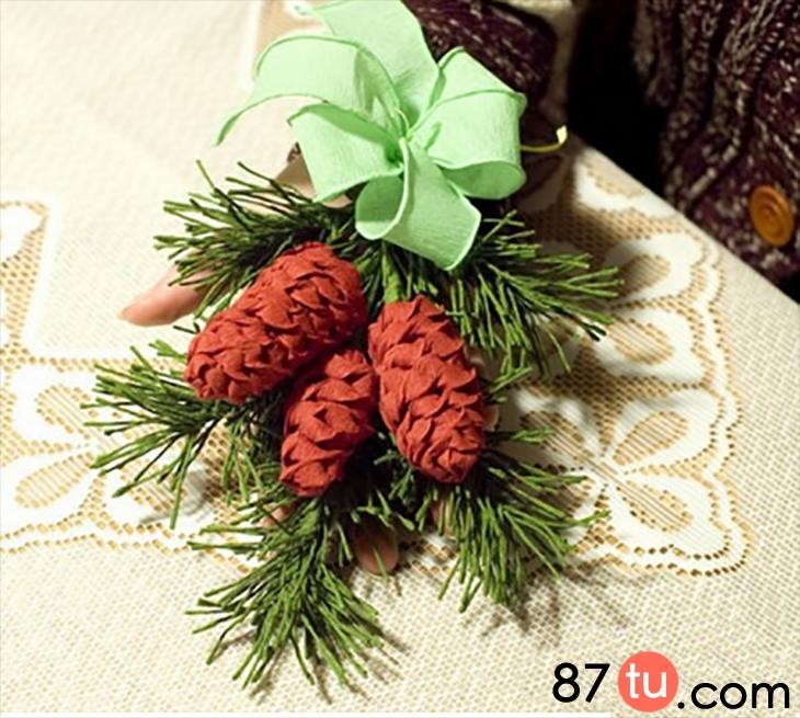 一颗松果制作好了,在松果的尾部缠上绿色的皱纹纸。