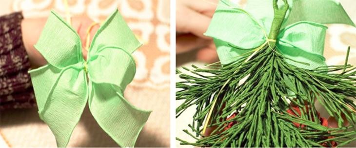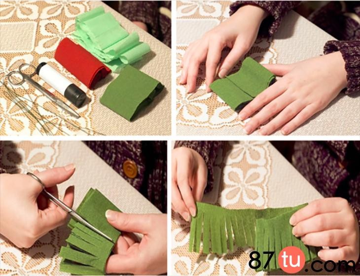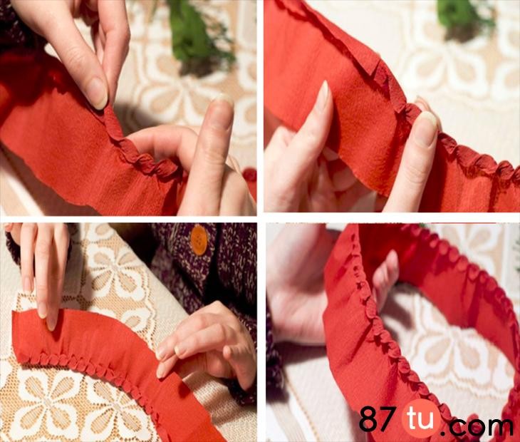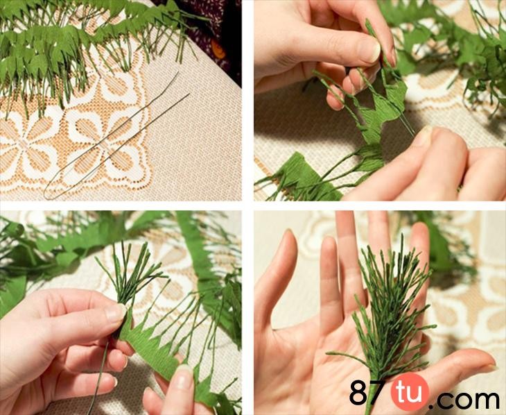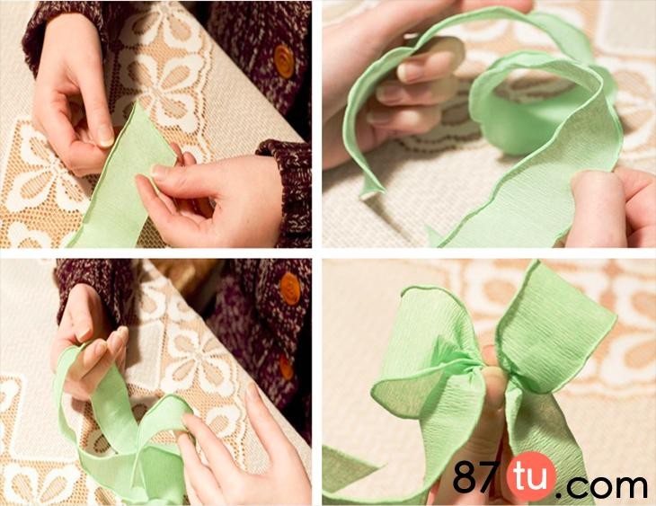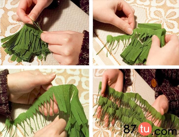 裁剪出绿色皱纹纸宽度约为5cm,剪出宽流苏。