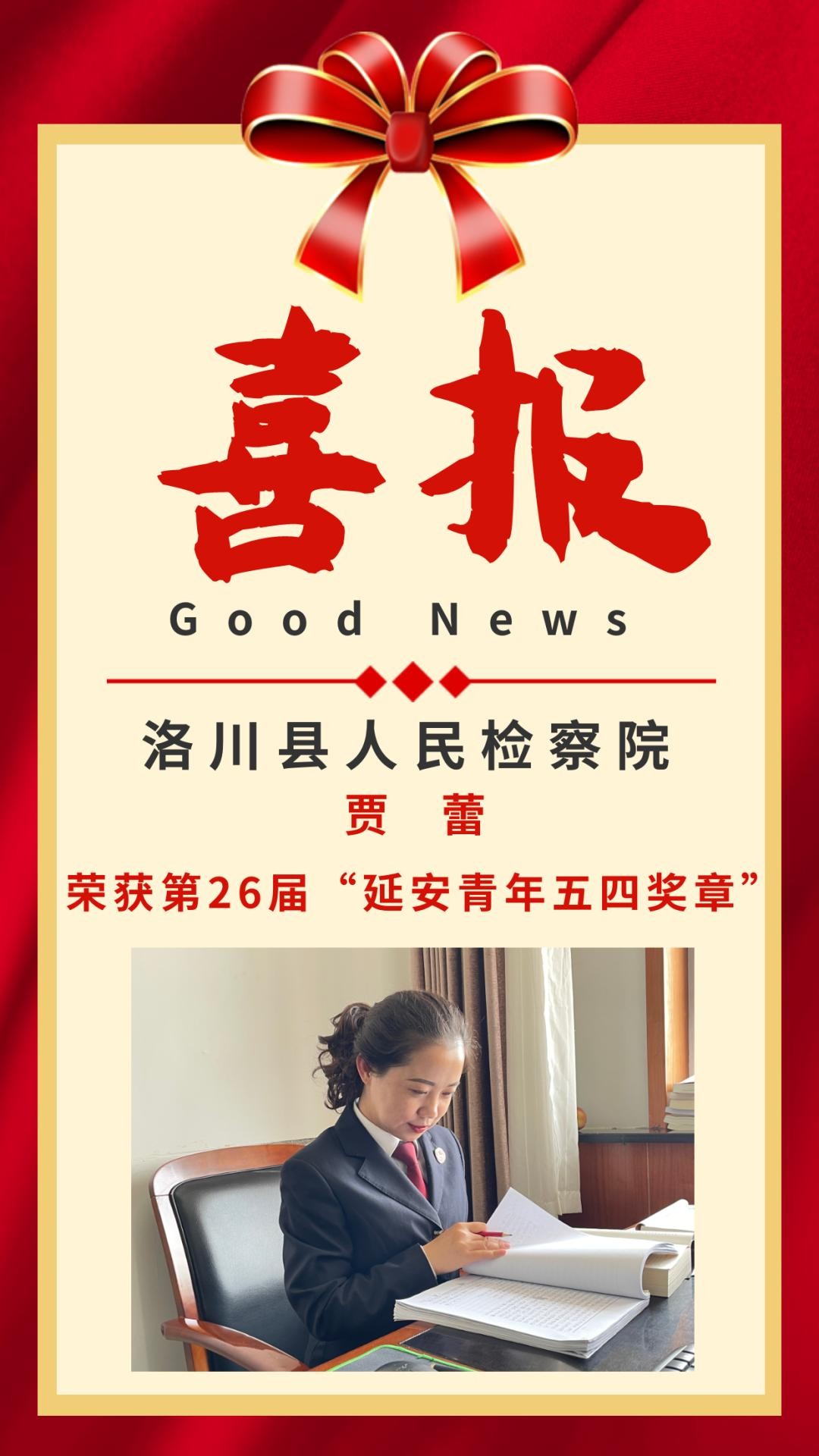 【喜报】洛川县人民检察院贾蕾荣获第26届“延安青年五四奖章”