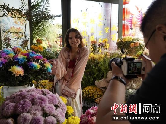 图为来自摩洛哥留学生Douae Esadqui在菊花前拍照“打卡”。 夏青华 摄