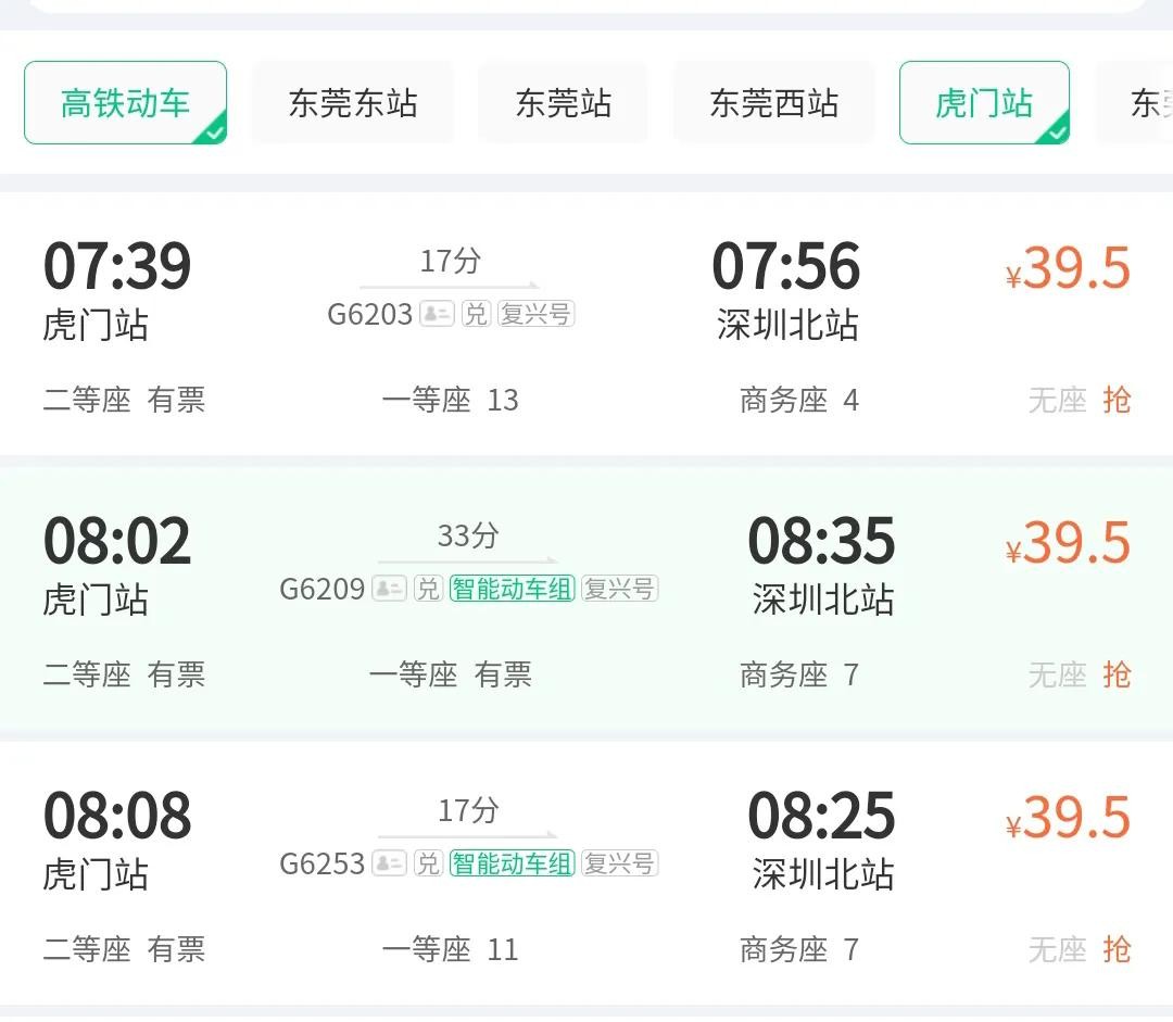 然后又从虎门站→坐高铁到深圳北站,票价是39.5元。