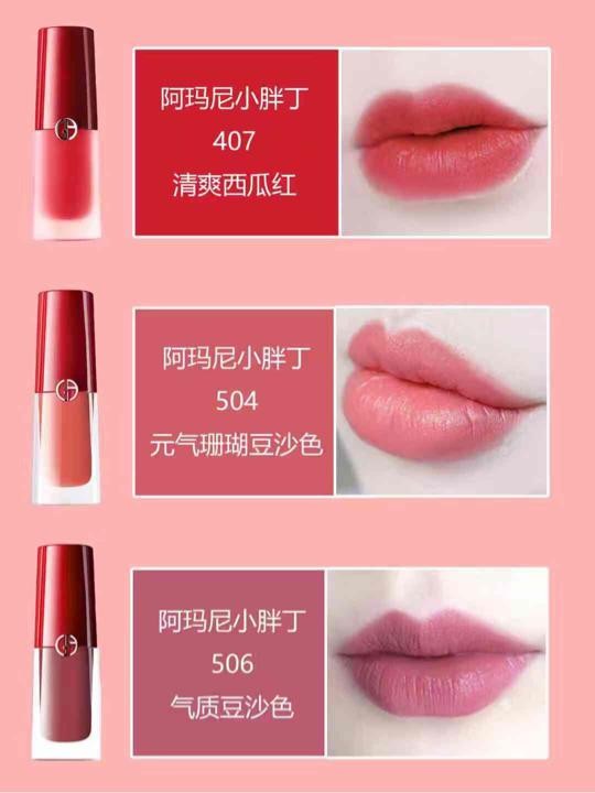 阿玛尼的小胖丁系列算是阿玛尼持久度最好的系列了,这款口红就像它的名字一样,矮胖矮胖的,非常可爱,但是这几款颜色都是非常百搭的,407就是清新的西瓜红,浅涂就是素颜也能很好的持妆,504是元气满满的豆沙色,我想每个女生都有这么一款口红 吧,但是我最喜欢的就是这款506最正统的豆沙色,这款不像上面的豆沙色偏橘,所以我更喜欢第二款显白的豆沙色。