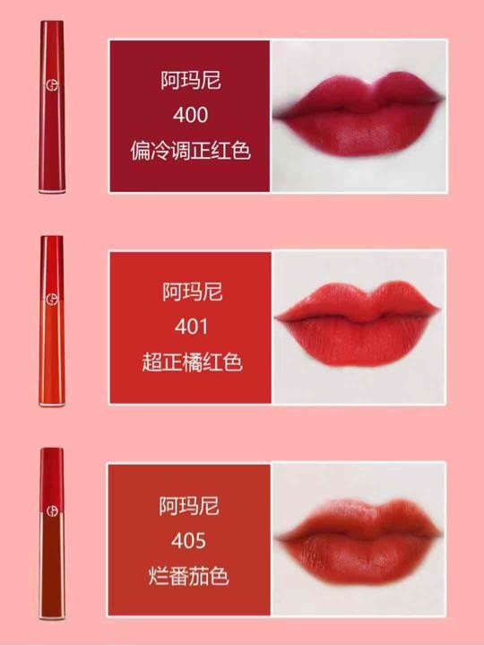 阿玛尼的红就是405给带起来的,这只已经卖断货的颜色真的是每个女孩子都想入手的唇釉,不仅显白,而且非常滋润哦,但是一点也不黏腻,跟401有点类似,但是要比着405色度有点深,而405就有点偏橘了,400就是偏冷调的正红色了,有点冷艳的颜色。