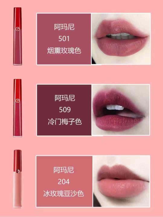 这三款阿玛尼的颜色是比较偏淡的,501是比较偏淡的烟熏玫瑰色,即使素颜涂也没有任何压力,与泫雅同款色系有点类似哦z,204有点雷同只不过颜色偏淡有点接近于裸色,那么509就是比较冷艳性感的梅子色了,超级适合深秋的妆容了。