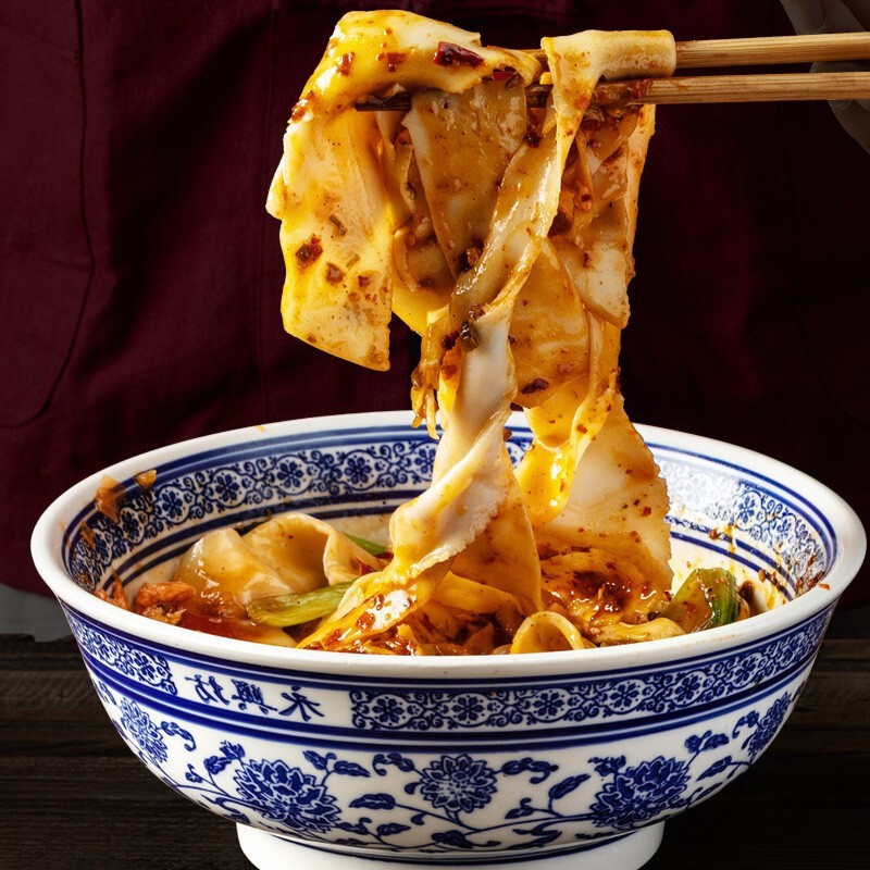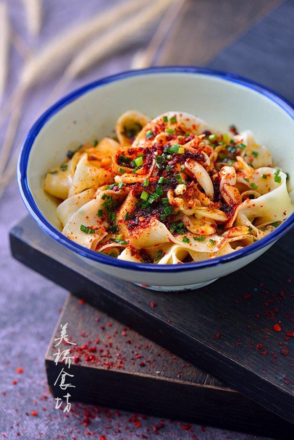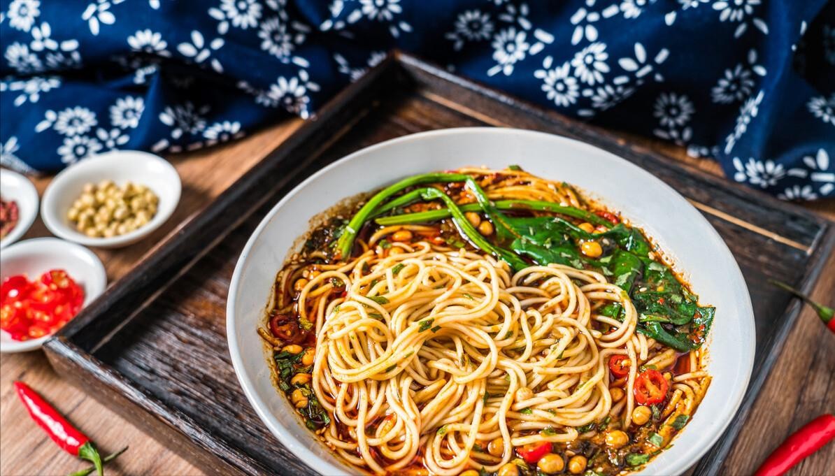 陕西的油泼面是一种具有悠久历史的传统美食,以其丰富的口味变化而闻名。它独特的特点是面条Q弹有嚼劲,再搭配上多种调料,整碗面条呈现出红亮的色泽。