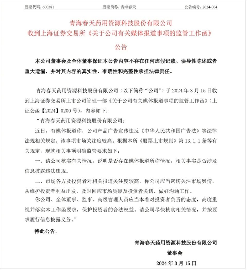 随后,青海春天药用资源科技股份有限公司发布公告称,收到上海证券交易所《关于公司有关媒体报道事项的监管工作函》。
