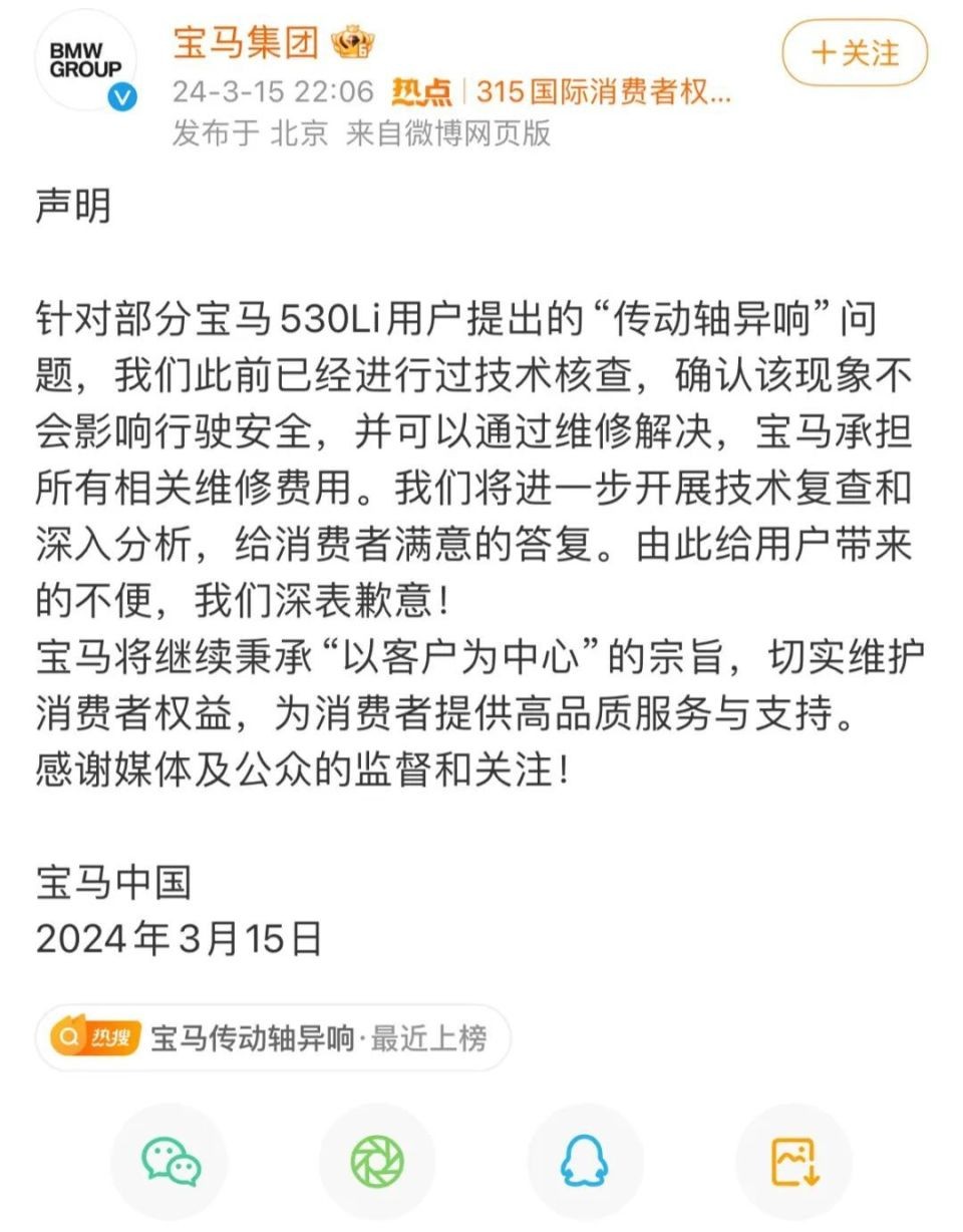 “3·15”晚会曝光宝马530Li车型传动轴异响后,宝马中国相关负责人对记者表示,针对部分宝马530Li用户提出的“传动轴异响”问题,我司此前已经进行过技术核查,确认该现象不会影响行驶安全,并可以通过维修解决,宝马承担所有相关维修费用。