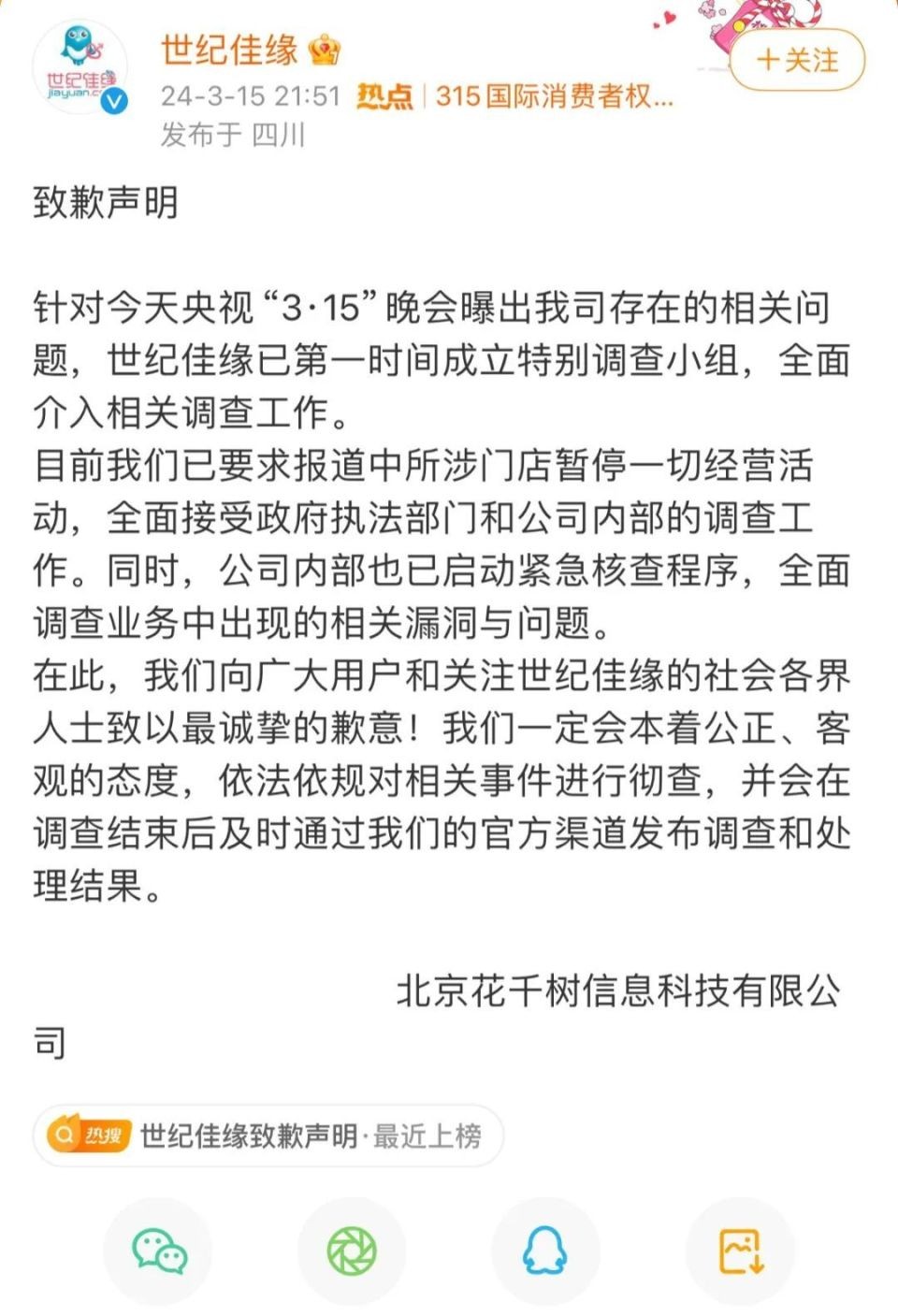 世纪佳缘发布致歉声明称,针对今天央视“3·15”晚会曝出我司存在的相关问题,世纪佳缘已第一时间成立特别调查小组,全面介入相关调查工作。