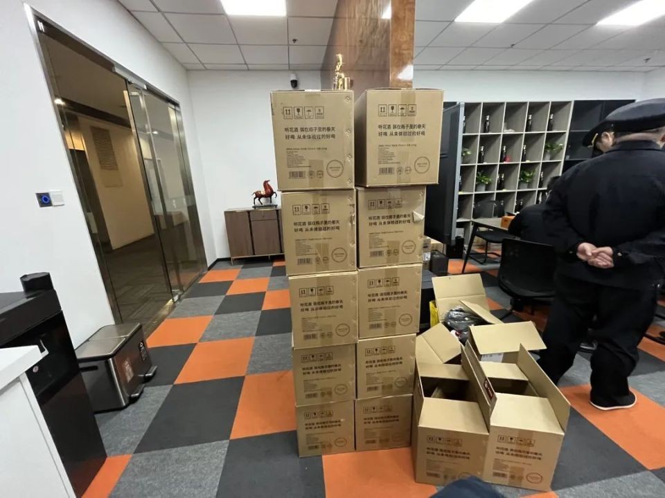 执法人员通过现场问询获悉,该公司去年9月签订听花经销商协议,今年1月开始在上海办公,平时有2名工作人员维护。工作人员称该酒主要卖给个人。办公现场的置物柜摆放部分听花酒空瓶,工作人员称只用于展示。办公室堆放着70余箱原装听花酒,办公桌上整齐放着宣传资料,包括3·15晚会提到的《中国食品》杂志等。