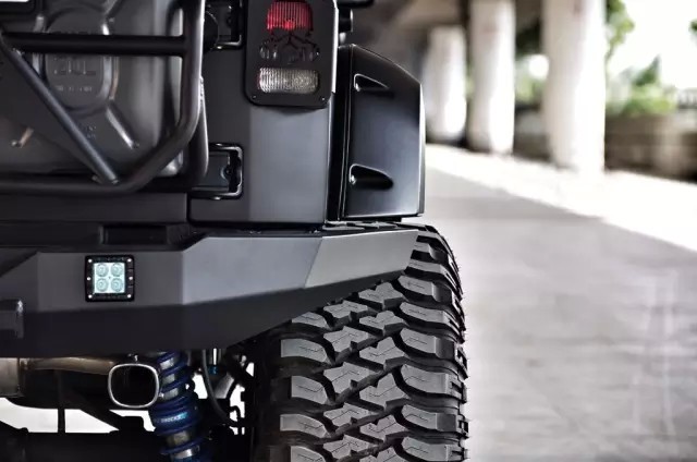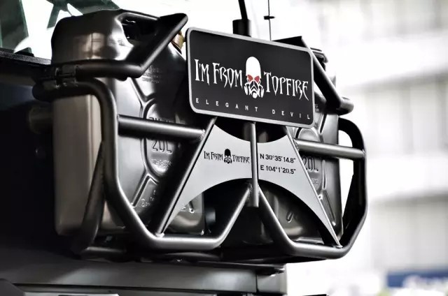 KING绞牙减震与氮气阻尼的搭配,面对任何路况,均可从容应对。FUEL BEAST 系列轮毂自面世以来,极具质感的配色以及大气五辐造型,早已深入人心。 20X12J , ET: - 48 的数据,搭配38X15.5 R20的MICKEY THOMPSON 轮胎,足够的宽度才能搭配超宽的“劳拉轮眉”。然而,如此尺寸的轮胎必定让尾门“不堪重负”。为排解这一尴尬,我们配备了TOPFIRE定制油桶架,管制造型足够轻盈,为尾门减负不少,同时可携带两只SCEPTER军用油桶,40L的容量让驾车外出远行再无后顾之忧。