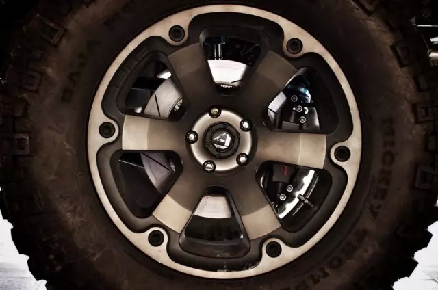这辆牧马人的大脚改装自AX756带防脱圈的轮毂(20*10J/ET-48),搭配东洋轮胎37*13.5 R20MT,这样的组合征服那些崎岖的山路完全没有问题。