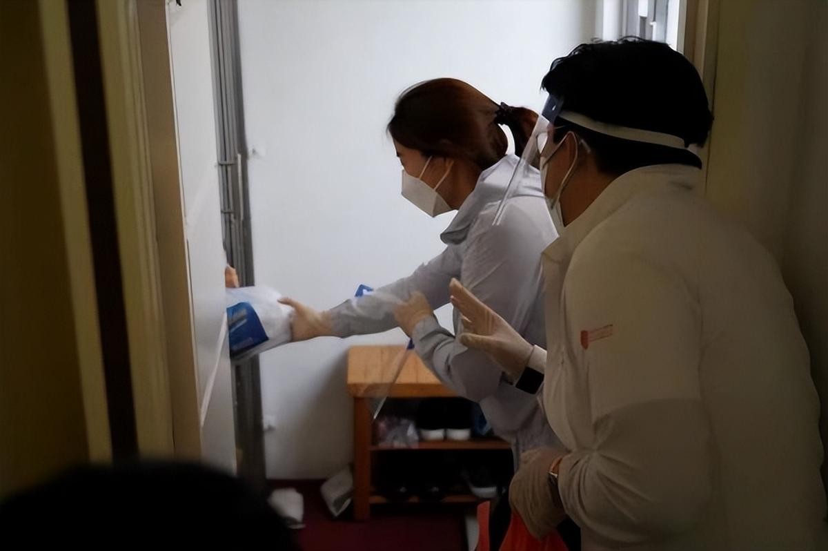 夫妻两人走街串巷为群众送物资,并且十分有礼貌,不仅弯腰将物资递上,并且脸上洋溢着笑容。