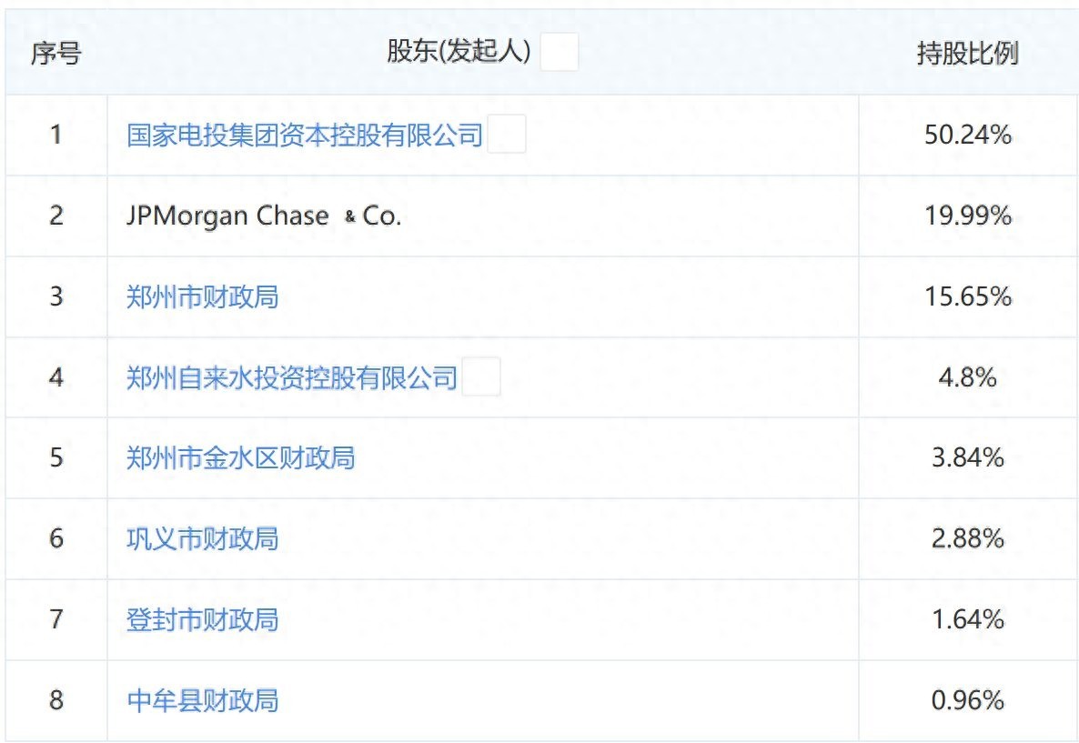 企查查股权穿透显示,百瑞信托的第一大股东是央企国家电投集团资本控股有限公司,持股50.24%;第二大股东是外资企业JPMorgan Chaes Co(摩根大通),持股19.99%;第三大股东位郑州市财政局,持股15.65%,其余股份由郑州市下辖区县财政局和国资企业持有。