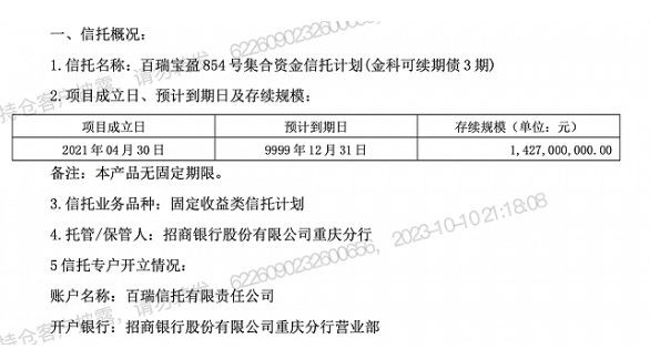 据了解,该信托产品全称为“百瑞宝盈854号集合资金信托计划(金科可续期债3期)”(下称:百瑞宝盈854号),受托人为百瑞信托,托管/保管人为招商银行重庆分行。