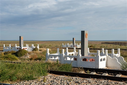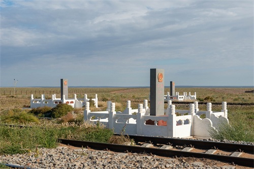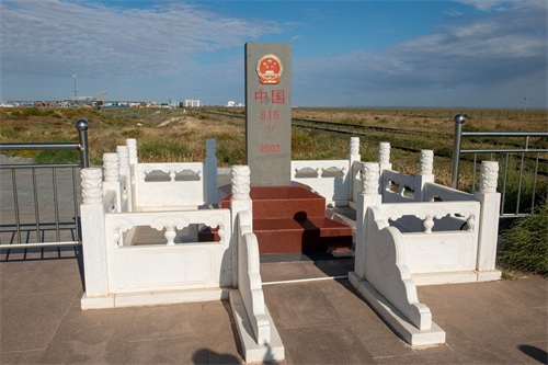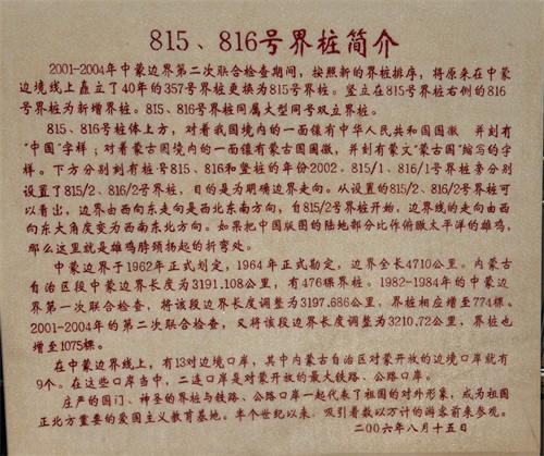 走出国门展厅继续向前就是界碑。矗立在中蒙边境二连—扎门乌德口岸815、816号界碑,是全国边界站点唯一的一处双号双立界碑,距二连浩特市和蒙古国的扎门乌德市均为4.5公里。目前的815(1)、815(2)、816(1)、816(2)号四块界碑分别矗立在两条铁道的两侧,大理石碑身,两面分别嵌有两国镀金国徽,庄严肃穆。
