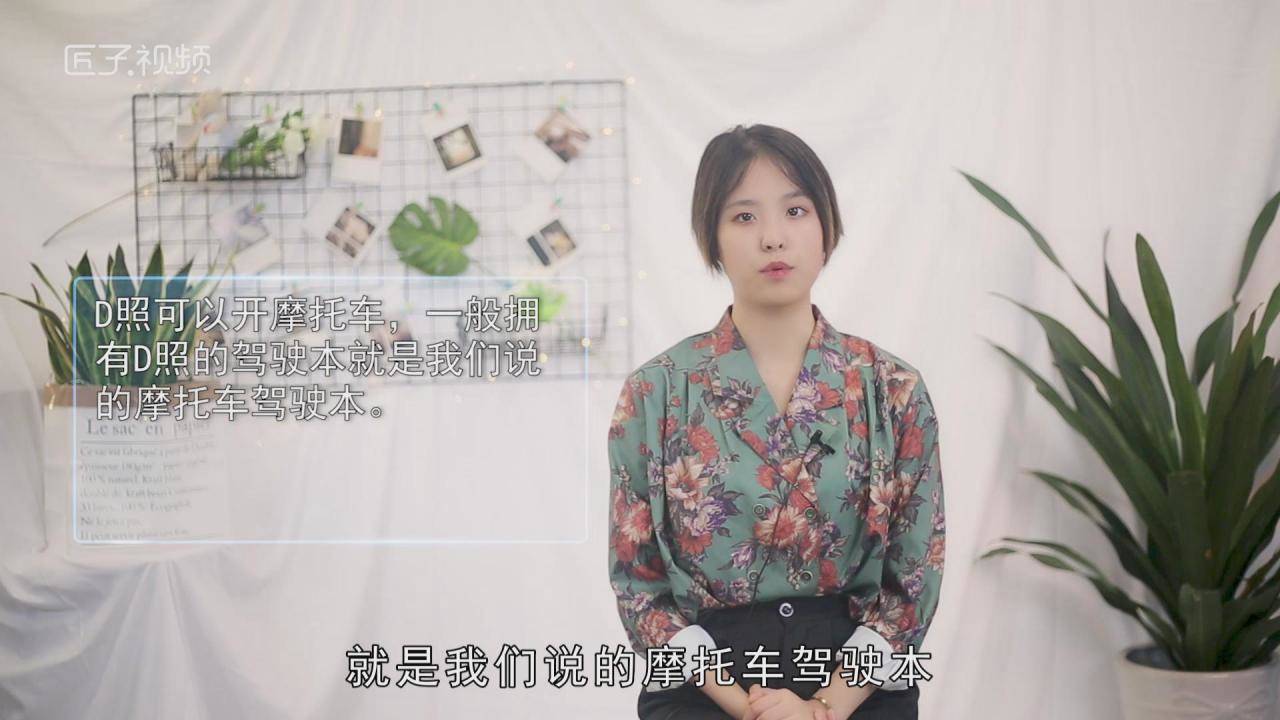 一般拥有D照的驾驶本就是我们说的摩托车驾驶本,其准驾车型是:发动机排量大于50ml或者最大设计车速大于50km/h的三轮摩托车;发动机排量大于50ml或者最大设计车速大于50km/h的二轮摩托车;发动机排量小于等于50ml,最大设计车速小于等于50km/h的轻便摩托车。