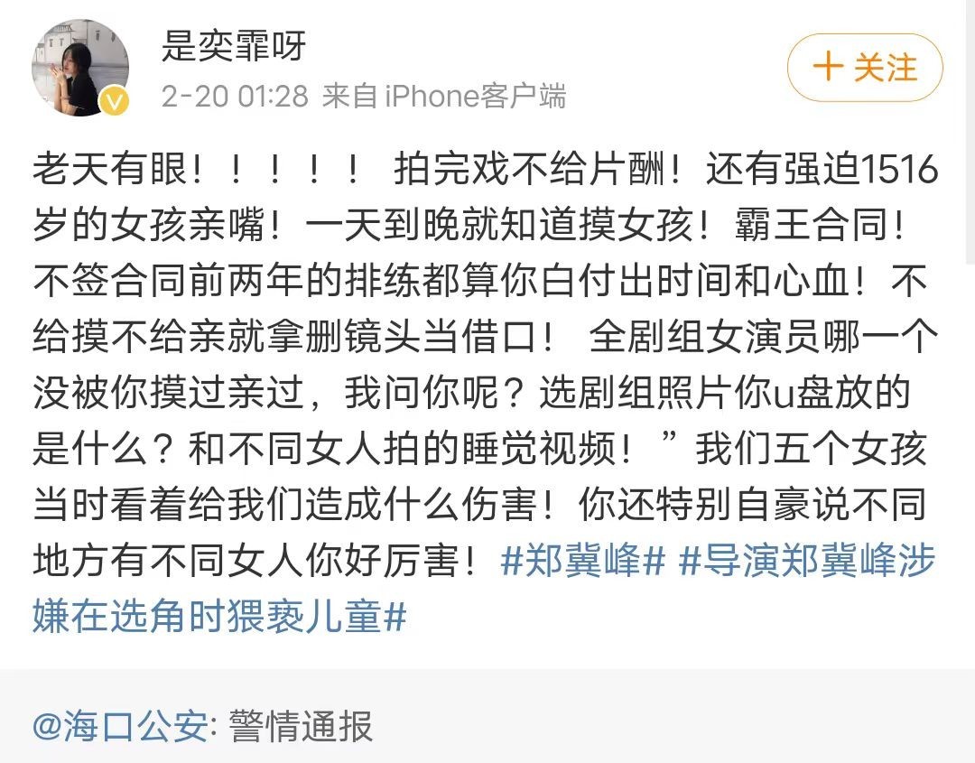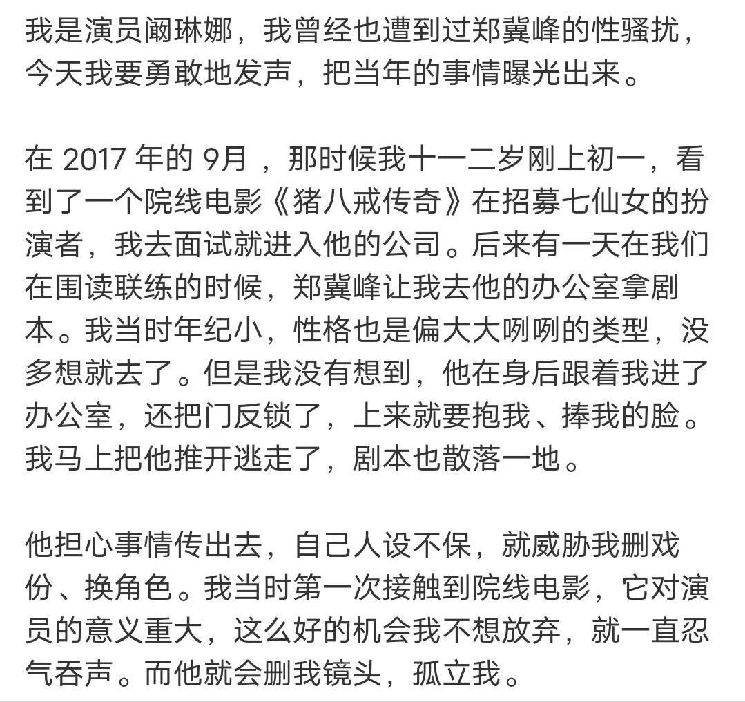 除了不断侵害未成年女演员外,郑某峰似乎还存在拖欠工资、片酬等种种行径。