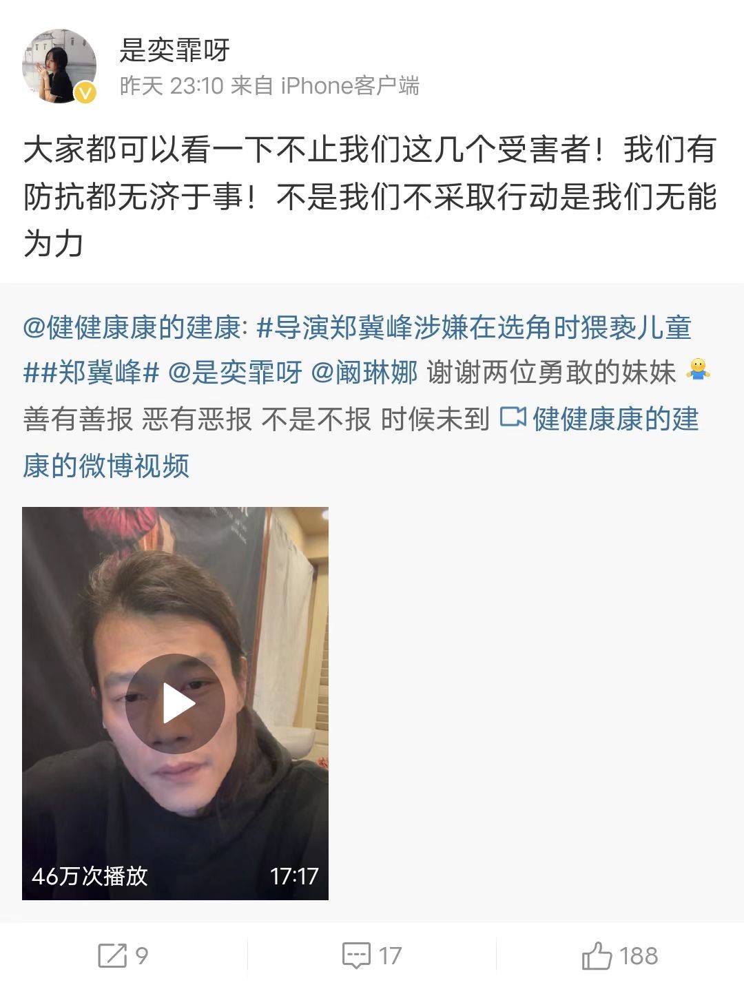 另一位网名为“是奕霏啊”的女演员,也在社媒上揭露了郑某峰曾经的丑恶嘴脸。