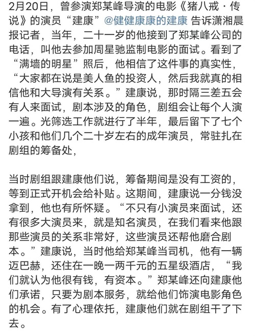 曾参演《猪八戒传说》的演员“建康”称,当年二十一岁的他接到了郑某峰公司的电话,让他去参加周星驰监制电影的面试。
