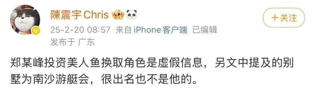 周星驰经纪人陈震宇通过社媒发文,明确否认了郑某峰投资《美人鱼》换取角色的传闻。