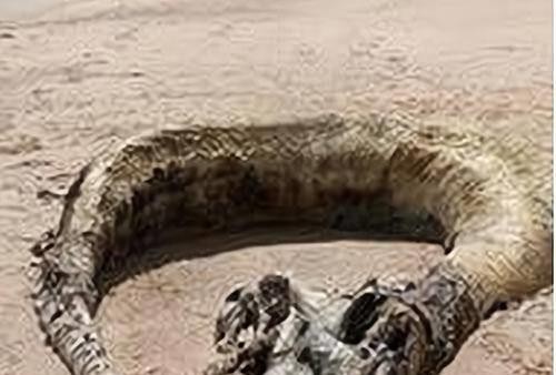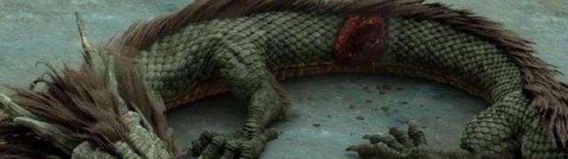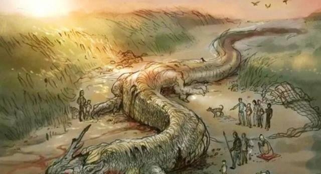然而当他们来到芦苇荡之后,这个动物身上的皮肤已经严重腐烂,几乎只剩下一具骨架。人们能看到的,只有一具骨架,还有两个角,像鹿角一样但更粗、更长。鳞片也散落在周围,多得足以可以装两箩筐。
